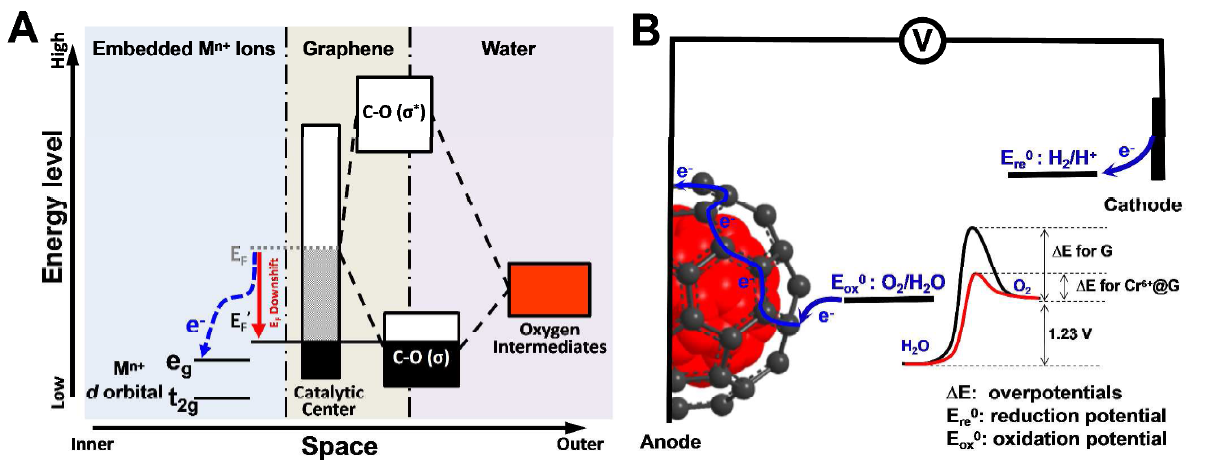 能源转换、存储和利用需要开发廉价、高效的新能源材料。(光)电化学分解水制氢(2 H2O → 2 H2 + O2)、二氧化碳转换利用(x CO2 + y/2 H2O → CxHyOz + (4x+y-z)/4 O2)以及金属-空气电池(MxO → xM + 1/2 O2)等能源转换过程普遍受制于水氧化过程(OER),因此改善OER动力学对提升能量转换效率至关重要。作为理想的电极材料,石墨烯已获得广泛重视与利用,但在OER中,仍受限于低活性与低稳定性。在石墨烯催化OER过程中,反应中间物种*OH, *O, *OOH与C原子形成C-O键(σ)与C-O反键(σ*)。在阳极正偏压下,石墨烯费米能级(EF)不断降低,降至σ能级位置满足电子由氧物种向C传输的热力学条件,使得水分解反应发生。相较于理论水氧化平衡电极电位(1.23 VRHE), 绝大多数电催化材料需超过350 mV过电势才能实现10 mA cm-2水氧化性能,这是由于OER各中间反应步存在较大活化能垒,即动力学因素限制。如何有效降低石墨烯EF并减小OER各中间活性物种转变活化能对改善水氧化性能至关重要。