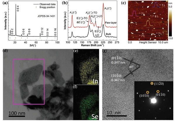 g) InSe纳米片的HRTEM图,插图为其SAED图。