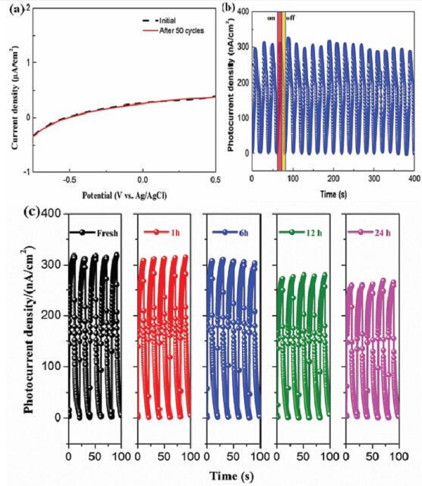 a)在0.2 M KOH电解液中InSe纳米片光电探测器的循环稳定性;
