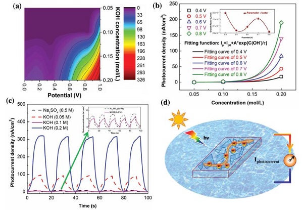 a) 光电流密度图关于偏压和KOH的浓度变化的函数;