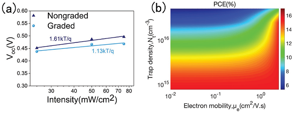 b)使用SCAPS软件对PCE在电子迁移率和陷阱密度方面的理论模拟表明,提高载流子迁移率和降低缺陷密度可以将器件性能增强高达16%