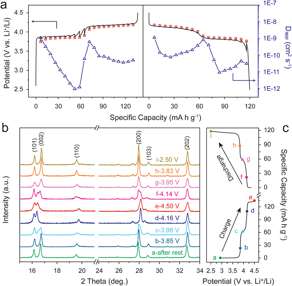 b,c)在不同的充电/放电状态下,在0.013A g-1的电流密度下NVPOF电极的第一个循环期间收集的非原位XRD图案以及相应的GCD分布图