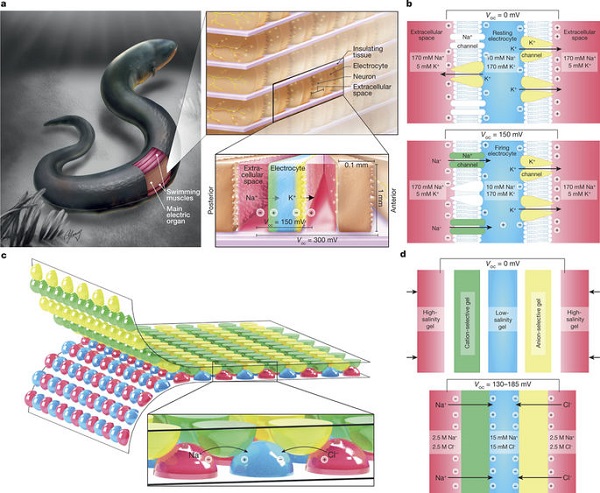 推进技术与生物体的结合要求电源具有生物可相容性、机械灵活性,并能利用生物系统内部的化学能。密歇根大学Michael Mayer(通讯作者)等人受电鳗启发开发出一种软电源。通过将阳离子和阳离子选择性凝胶膜的重复排列形成微型聚丙烯酰胺凝胶,实现凝胶组分间离子梯度变化,体系堆叠后形成的导电通路可产生110伏的开路电压,同时每凝胶电池平方米达到27毫瓦。这种电力设备可用以为下一代可移植材料如起搏器、传感器或假体等设备供能。
