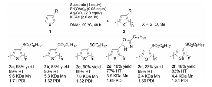 高度立体规则的导电聚合物,如聚(3-取代噻吩)(rrP3STs)是一类重要的π-共轭聚合物,可用于塑料电子器件如太阳能电池和现场晶体管。但是,rrP3ST的现有合成技术全都涉及过渡金属催化的杂芳基卤化物或拟卤化物与杂芳基有机金属试剂的交叉偶联。本文中介绍了一种安全、有效的方法,直接交叉耦合sp2 C-H键。更重要的是,该方法不仅具有较高的区域规整性(高达99%),而且可应用于具有不同结构和取代基团的一系列底物化合物。这提供了一个通用、直接的方法来方便获得许多功能/导电聚合物。