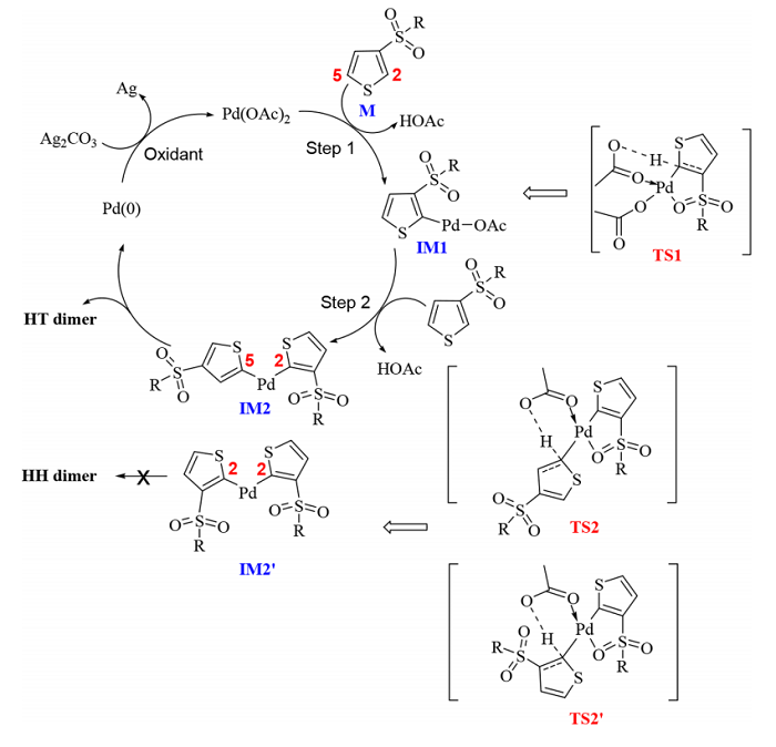 π共轭聚合物作为重要的导电/半导体材料已经引起人们的广泛兴趣,在这些不同的(半)导电聚合物中,聚噻吩(PT)可能是最重要且被广泛研究的材料,并且已经被用于各种应用如场效应晶体管(FET)、聚合物发光二极管(PLED)、太阳能电池和化学传感器中。由于区域规整性不同,具有相似共轭/聚合长度的相同材料单体单元在大多数情况下具有不对称结构,进而会影响其性能。这是因为不对称单体的聚合常常由于多个活性连接位点而导致形成混合物聚合物。对于聚噻吩,最常用的3-取代的噻吩单体,通常在重复单元(2,2’,2,5’和5,5’)之间形成含有三个区域-化学键的聚噻吩结构的混合物,即,HH,HT和TT。在过去的几十年中,研究人员制备了高度区域规整的HT偶联的具有烷基或烷氧基的P3STs,一般需要通过过渡金属催化的杂芳基卤化物或拟卤化物与杂芳基有机金属试剂的交叉偶联来形成碳-碳键或双杂芳基键。虽然这些方法已经取得了巨大的成功,但是它们都需要具有含金属或卤化物官能团的单体,导致效率低、中间材料获取困难。