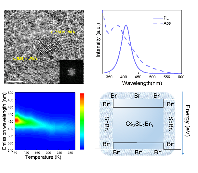 图3.无机锑基钙钛矿(Cs3Sb2Br9)量子点高效发光机制表征