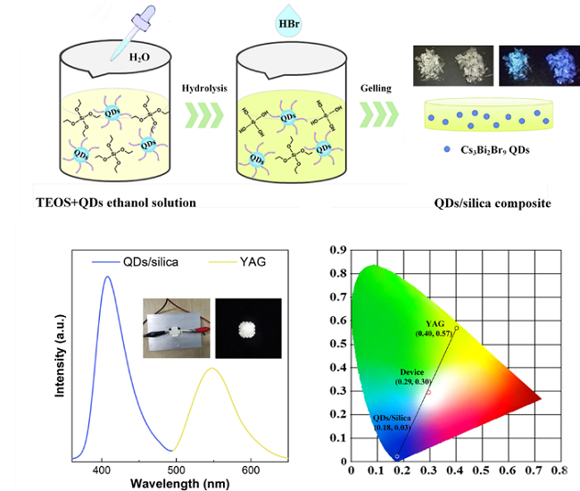 近期,该团队进一步利用Cs3Bi2Br9不溶于乙醇的性质,在配体辅助沉淀过程中采用乙醇作为反溶剂,成功制备荧光量子产率为19.4%的Cs3Bi2Br9量子点。同时,由于反溶剂中痕量水的引入,诱导Cs3Bi2Br9量子点表面形成BiOBr钝化层,有效提高了Cs3Bi2Br9量子点的水稳定性。最后,利用其良好的水稳定性,通过一步法制备Cs3Bi2Br9量子点/硅胶复合物,与YAG荧光粉混合后,制备出非铅白光LED器件。