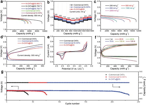 图3 a) 五种正极材料在500 mA g−1电流密度下的放电容量; b) 三组不同正极材料在锂氧电池中的倍率性能; c) N-CNTs@SS材料在不同电流密度下的放电容量; d) 三种正极材料在锂氧电池中的充放电曲线; e) 三种正极材料在0.1 mV s−1扫描速率下的循环伏安图; f) N-CNTs@SS 在500 mA g−1电流密度下的循环性能(比容量限制为1000 mA h g−1); g) 三种正极材料在500 mA g−1电流密度下的终止放电电压。