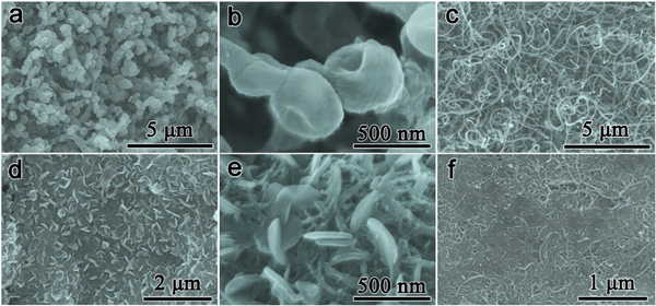 图4 a)N-CNTs@SS正极材料放电后的SEM图;b) 放电产物放大SEM图(终止电压2.2V);c) N-CNTs@SS 正极再次充电后的SEM图;d) N-CNT正极材料放电后的SEM图;e) 放电产物放大SEM图(终止电压2.2V);f) N-CNT正极再次充电后的SEM图。