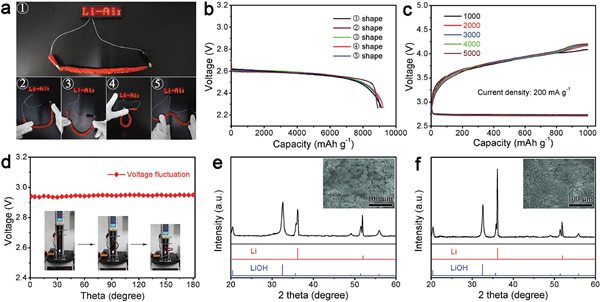 图5 a) 线型柔性锂空气电池在不同弯曲和扭结状态下点亮红色LED显示屏以及 b) 对应电压; c)线型柔性锂空气电池在几千圈弯曲后的充放电曲线;d) 柔性锂空气电池在0°到180°折叠时的开路电压;锂金属负极在43% RH下循环后的XRD衍射花样 e) 亲水性碳正极 和 f) 超疏水N-CNTs@SS正极,插图为锂金属负极在循环后的SEM图。