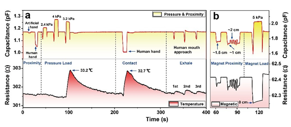 b. SCMN对磁场、压力和接近等刺激的实时监测。