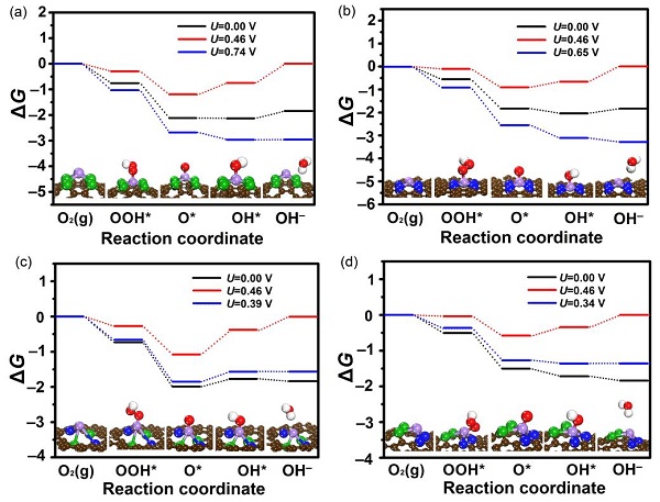 图1. (Ge, N, P) 三元掺杂石墨烯在碱性条件下的ORR反应路径(a: Ge-P4; b: Ge-N4; c: I-Ge-N2P2; d: A-Ge-N2P2.)
