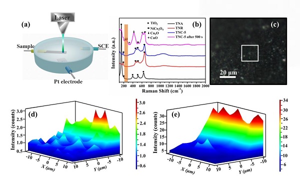 图2 原位拉曼装置及其mapping测试,其中d和e图显示了OER前后铜峰强度(b图中橙色波数范围)在20μm×20μm范围内的变化。