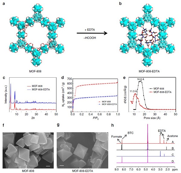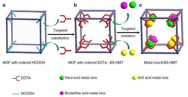 MOF-808中有序的HCOOH(a)可以被EDTA取代形成具有有序EDTA的MOF-808(b),然后作为BS-HMT(c)用于金属离子捕获。