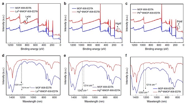 分别为MOF-808-EDTA负载La3+、Hg2+和Pb2+前后的宽扫描XPS谱(a-c)和FI-IR谱(d-f)。