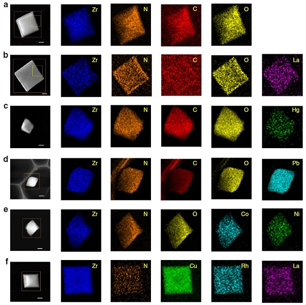 (b-d)单金属体系的STEM-HAADF图(标尺: 100nm)和相应的元素分布(分别为负载La3+、Hg2+和Pb2+的MOF-808-EDTA);