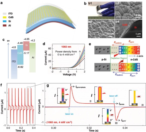 此外,硫化镉由于其非中心对称性而具有热释电性能,当温度变化时将产生热释电极化电荷,从而在沿着硫化镉晶体的极性方向获得一个瞬时电势。p型半导体和n型半导体之间形成pn结,通过热释电电势可以调制pn结的内建电场,从而影响载流子的光电过程,这一现象被称为热释电光电子学效应(Pyro-Phototronic Effect)—— 一种基于热释电效应、光激发和半导体三者之间的耦合效应。基于热释电光电子学效应,可以实现快速和宽谱的光探测。