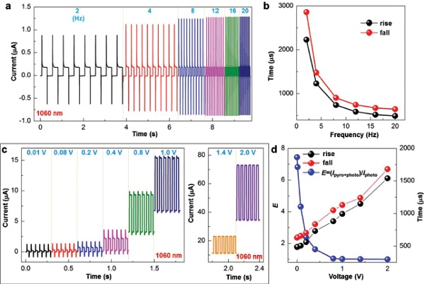 (d). 器件在不同偏压下的响应时间,以及光致热释电增强系数。