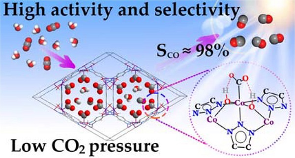 通过光化学反应将二氧化碳转换为燃料依赖于高效的高选择性的催化剂。中山大学的廖培钦博士和张杰鹏教授(共同通讯)证明了催化活性金属中心可以与邻近的氢化物配体配合,提高光催化二氧化碳的还原性能。 研究了六个钴基金属有机骨架与不同协同环境之间的关系(光敏剂,电子给体,水/有机混合物,可见光)。在1.0 atm的纯CO2中, MOFs有μ-OH– 配体和临位的Co中心展现出CO 98.2%选择性并且TOFs达到0.059 s–1。当CO2 分压降到0.1atm时,TOF只降低了20%,其他MOFs至少降低90%。周期密度函数理论计算和同位素跟踪实验表明μ-OH– 配体不仅提供强的H键供体来使原始Co-CO2附加物稳定而且提供局部质子源来使C-O键破裂。