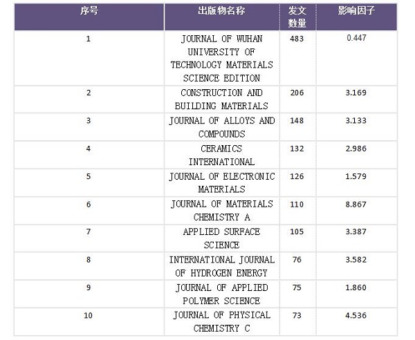 从表中可以看出,近十年发文主要集中在JOURNAL OF WUHAN UNIVERSITY OF TECHNOLOGY MATERIALS SCIENCE EDITION、CONSTRUCTION AND BUILDING MATERIALS 、JOURNAL OF ALLOYS AND COMPOUNDS 等几百余种杂志上,发文的期刊较为广泛。发文数量排名前十的文章主要集中在中科院分区二区,说明近十年武汉理工材料学科的SCI的论文相对来说质量较高。