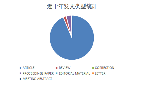 从图中可以看出,近十年材料学科基本都以Article的形式发表,共4593篇占比94%,PROCEEDINGS PAPER共发表182篇占比4%,REVIEW发表102篇占比2%,其余的几篇文章都以LETTER等形式发表。