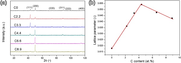 (a) 不同碳含量的XRD图谱,均为FCC单相