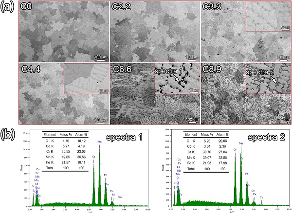 (a) 不同碳含量的Fe40Mn40Co10Cr10高熵合金的背散射图,插图对应高倍率下的形貌