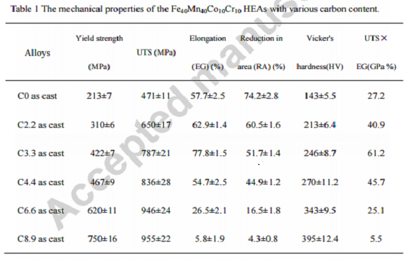 表1. 不同碳含量的Fe40Mn40Co10Cr10高熵合金的机械性能