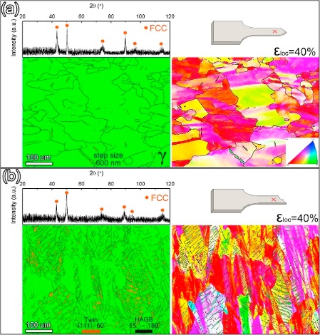 XRD图谱、EBSD相分布图以及反极图(IPF) 显示了C0高熵合金(a)和C3.3高熵合金(b)断裂后截面附近的微观组织。