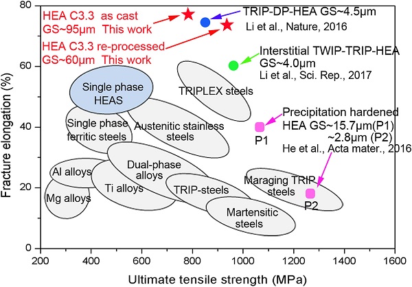 图8.高碳高熵合金和各种钢的断裂伸长率及极限抗拉强度的比较