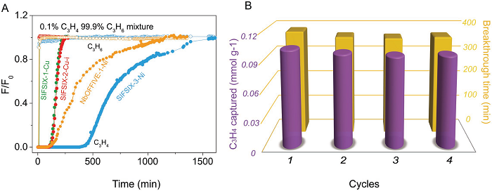 B)SIFSIX-3-Ni用于丙炔/丙烯(0.1/99.9)分离的循环性能测试。