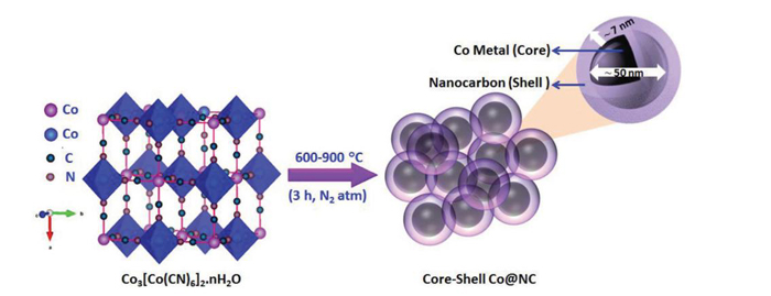 图5 由Co3 [Co(CN)6] 2·nH2O-PB合成核壳结构Co @ NC的示意图