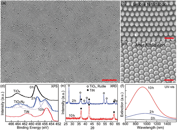 (f) 石英衬底上的TiOx,TiOxNy和TiN纳米阵列的紫外可见吸收光谱(UV-vis)光谱。