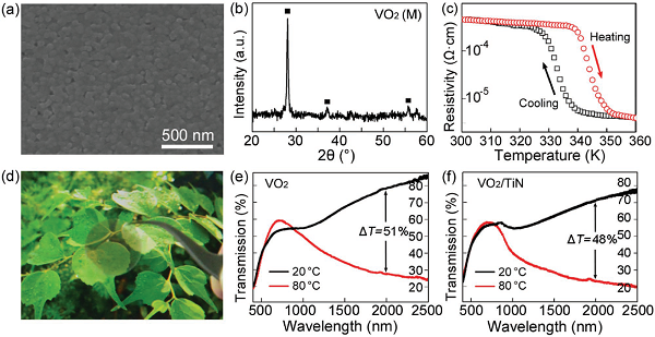 热变色智能涂层是一种可以根据温度变化智能地控制太阳辐射量的神奇材料。这些涂层在高温下能够阻挡红外(IR)辐射,同时还能使其在低温下通过。二氧化钒(VO2)由于可逆相变和优异的红外透过率调制性能,是一种极具发展前景的热致变色材料。最近,有学者报道了将VO2与氮化钛(TiN)等离子体纳米颗粒结合以制成可用于室温的智能涂层。