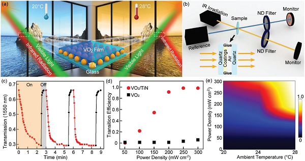 (a) 用作智能窗户涂层的混合VO2/TiN材料示意图;