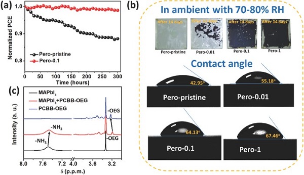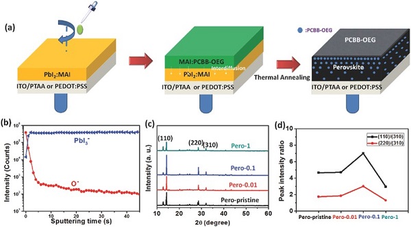 近日,苏州大学的李耀文副教授和李永舫院士(共同通讯作者)在Adv. Energy Mater.上发表最新研究成果“New Strategy for Two-Step Sequential Deposition: Incorporation of Hydrophilic Fullerene in Second Precursor for High-Performance p-i-n Planar Perovskite Solar Cells”。在该文中,研究者将亲水性的富勒烯衍生物(PCBB-OEG)添加到MAI前躯体溶液中,并通过两步连续沉积法引入到了MAPbI3薄膜中。通过此方法制备的钙钛矿薄膜实现了PCBB-OEG自上而下梯度分布,并且在钙钛矿上方形成了一层PCBB-OEG薄膜。与此同时,PCBB-OEG的引入也可以提高钙钛矿薄膜的晶体质量。研究表明所得到的高质量钙钛矿晶体不仅可以很好地生长在亲水性的PEDOT:PSS空穴传输层上,还能很好生长在疏水性的PTAA空穴传输层上。利用该方法获得的平面p-i-n型钙钛矿太阳电池的效率高达20.2%。更重要的是,利用该方法制备的器件在室温,湿度为70%的环境下暴露300小时后,该太阳电池仍可以保持98.4%的效率。此外,相应的柔性器件的效率也高达18.1%。