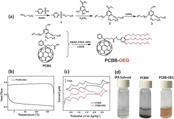 (c)PCBM和PCBB-OEG的循环伏安曲线