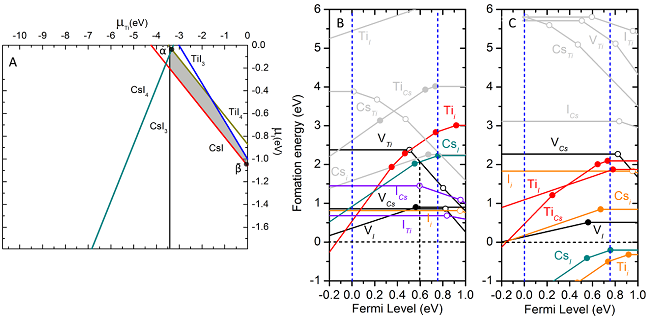 图二,针对可能的分解产物进行了化学势的计算,同时针对可能的缺陷态惊醒了计算,得到该Cs2TiI6较为稳定并且呈现N型的特征。