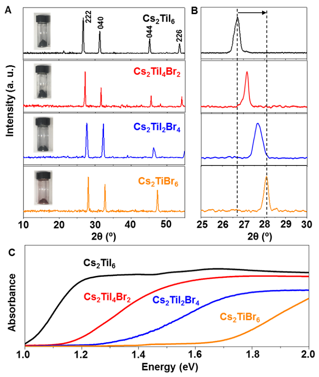 图三,实验合成Cs2TiI6-xBrx,发现其带隙覆盖1.0-1.8 eV的区域,是太阳能电池吸光层材料的理想带隙。