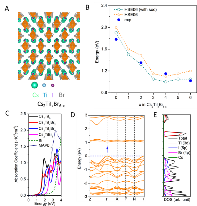 图四,通过对于Cs2TiI6-xBrx电子结构和带隙的计算验证了上述吸收光谱。