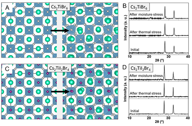 图五,首先通过AIMD模拟Cs2TiI6-xBrx系列的稳定性,通过对于稳定性的一列实验(热稳,473K,一小时;湿稳,70%RH,298K),发现Cs2TiI6-xBrx呈现了良好的稳定性。