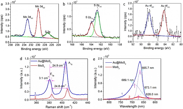 (a-c)Mo 3d(a),S 2p(b)和Au 4f(c)的XPS峰。