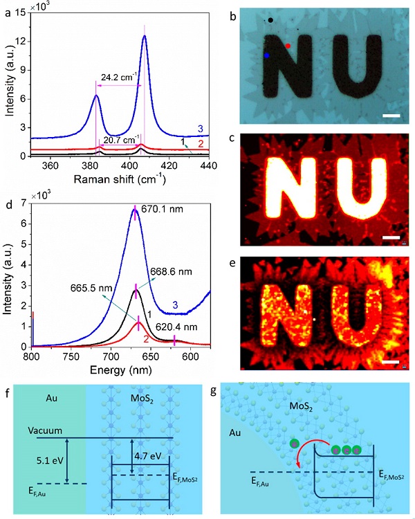 (g)Au@MoS2异质结构中重排的能带结构。(b、c和e中的比例尺:10μm)