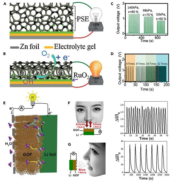图10: 基于石墨烯的智能电池对压力(A–D)和湿气(E–G)的响应。