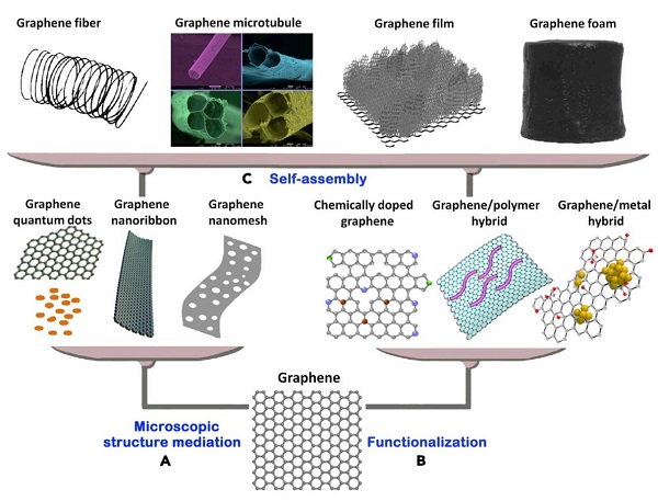 图1:(A)石墨烯的微观结构调控。通过裁剪2D的石墨烯片子,可以得到0D的石墨烯量子点、1D的石墨烯纳米带和纳米网。(B)石墨烯的功能化,包括杂原子掺杂的石墨烯如硼、氮、磷、硫、氟、氯原子等,基于石墨烯的复合物,如石墨烯/聚合物、石墨烯/金属原子、石墨烯/金属氧化物、石墨烯/碳化物等。(C)石墨烯的自组装,如1D的石墨烯纤维/管,2D的石墨烯膜,和3D的石墨烯泡沫。