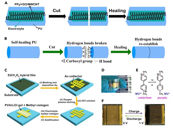 图11: 基于石墨烯的自愈合电容器(A–B)和电致变色的微电容器(C–F)。