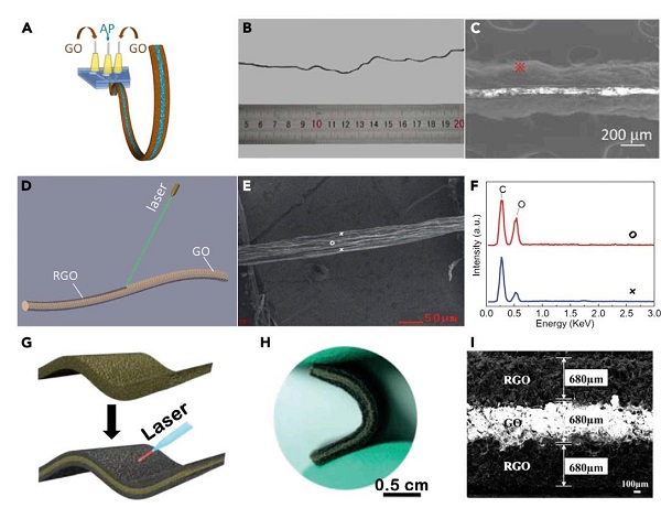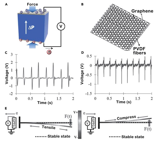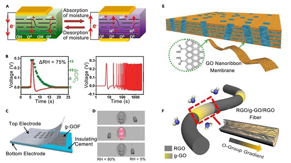 图2:(A–D)氧化石墨烯膜,(E)氧化石墨烯纳米带,和(F)氧化石墨烯纤维能产生电能对湿气的响应。