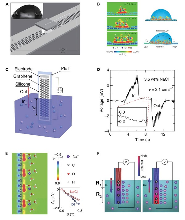 图3:单层的石墨烯发电机对移动的液滴(A–B)或流动液体(C–F)的响应。