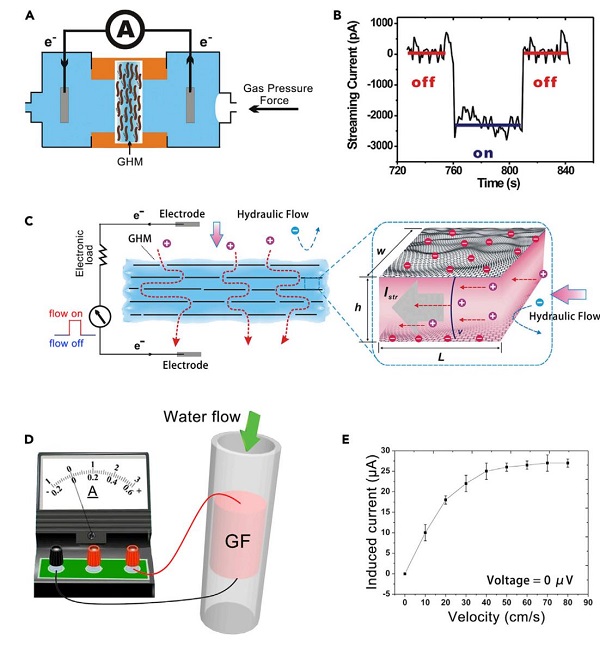 图4:(A–C)宏观的石墨烯膜和(D–E)石墨烯泡沫发电机对流动液体的响应。
