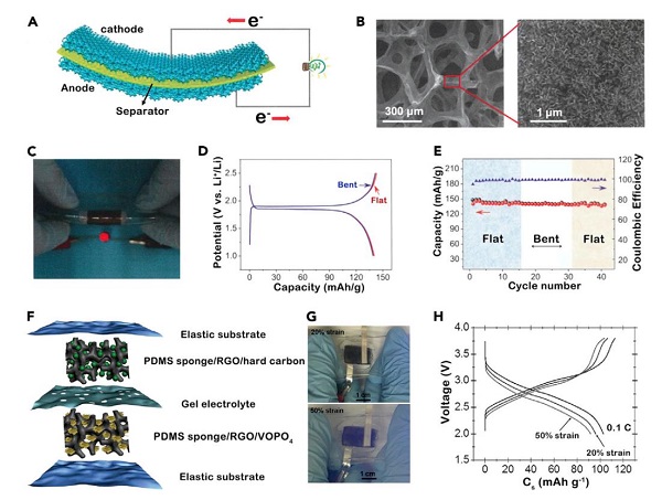 图8:基于石墨烯的柔性电池(A–E)和可拉伸电池(F–H)。